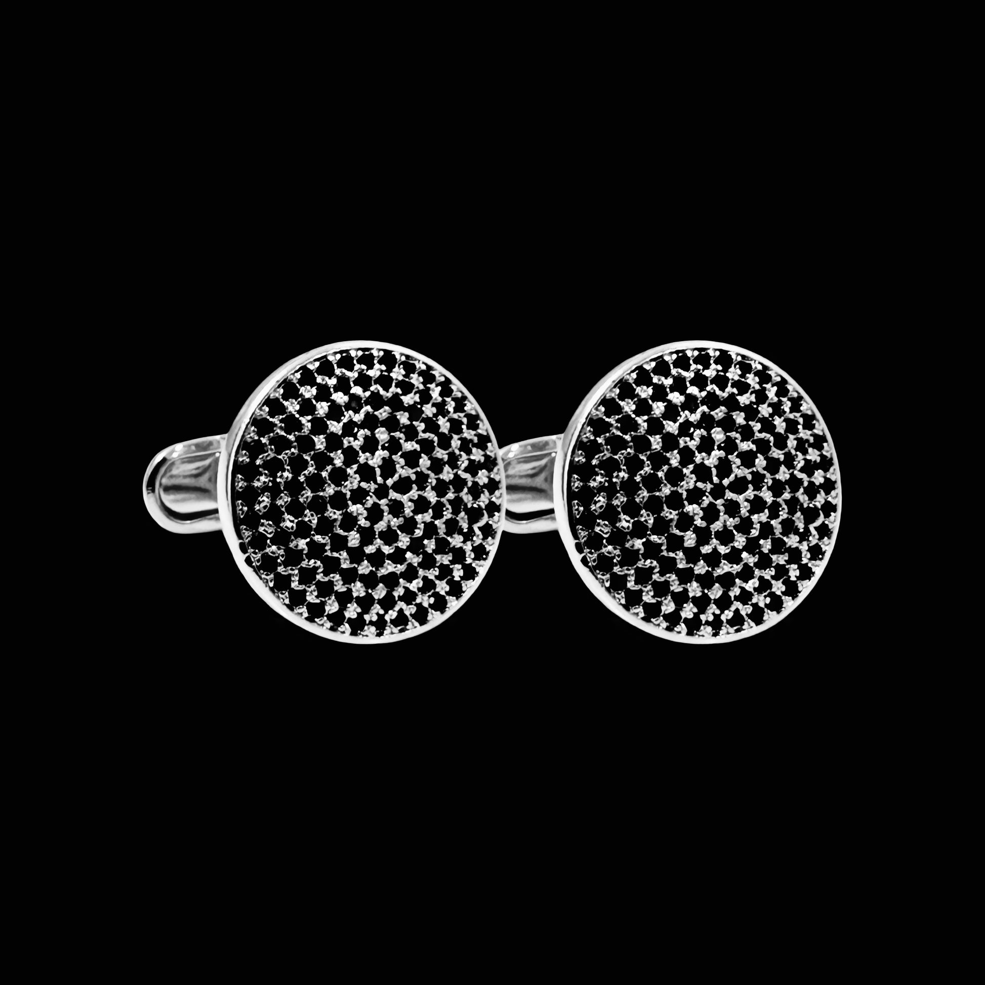 Meticulously crafted, these black cubic zirconia (CZ) crystals inlaid in 14k white gold-plated brass offer a sleek and sophisticated finish to any formal occasion. The luxurious round frame is ideal for an elevated and stylish look.